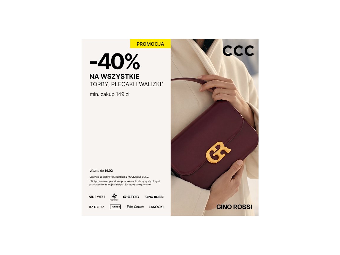Nowa torebka? Plecak? Walizka? A może kosmetyczka, która zmieści wszystko to, co niezbędne? Teraz w CCC modele znanych marek kupisz 40% taniej! Zrób zakupy za minimum 149 zł i zyskaj rabat na wymarzone torebki, plecaki, walizki lub kosmetyczki! Superceny czekają w CCC!
