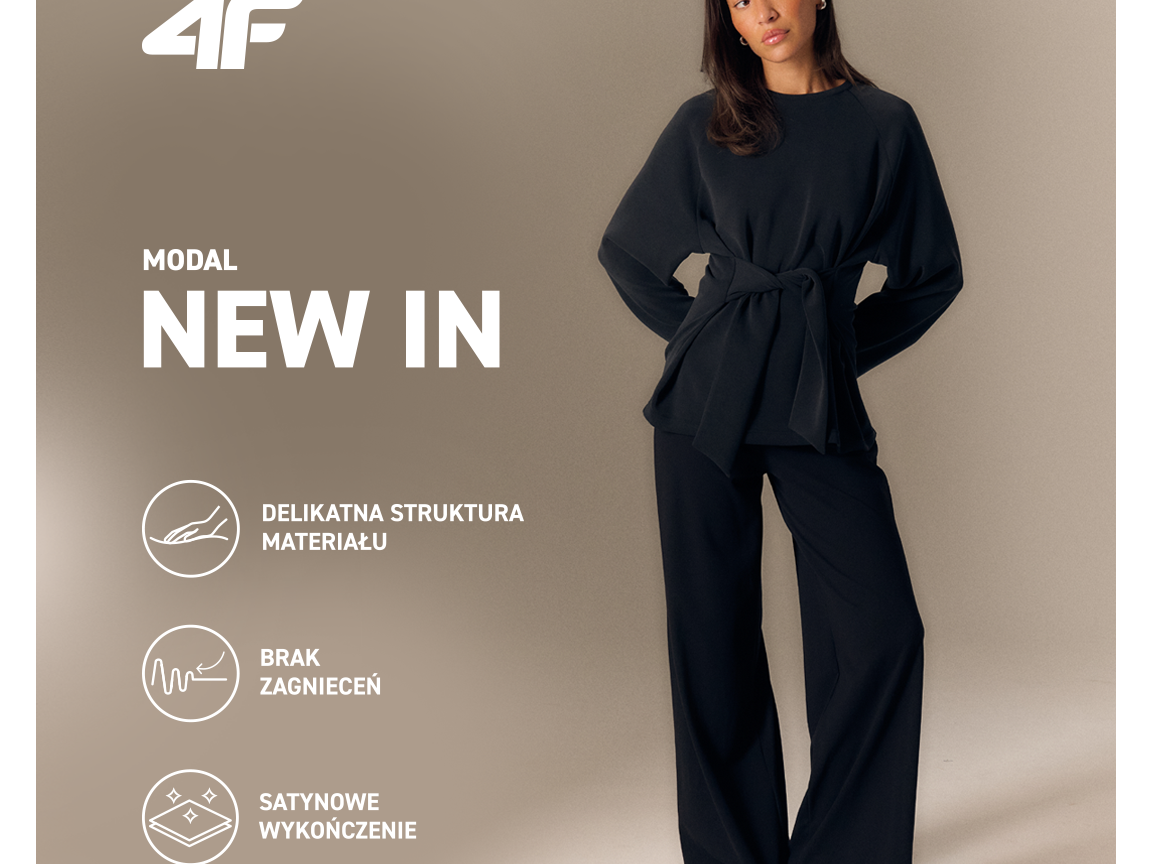 NEW IN MODAL, który łączy ruch i minimalizm. Miękkość premium, satynowy detal, komfort, który zostaje z Tobą. Kolekcja dostępna w salonach 4F i online.
